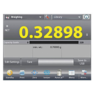 AutoCal™ fully-automatic internal calibration system, fast stabilization time, four touchless sensors, built-in ionizer with automatic door models, up to 14 operating languages, OIML models available, SAVE to USB function, menu lock switch, security bracket, integral weigh below hook for below balance weighing applications, removable stainless steel weighing platform, stability indicator, overload and underload indicators, auto standby.